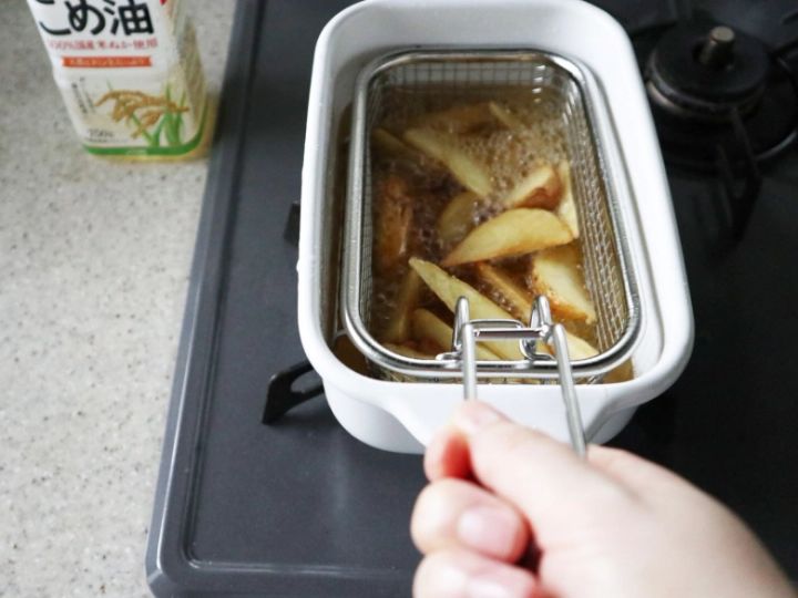 揚げ油は、さらりとしていて油切れが良い「こめ油」がおすすめです。⾐の仕上がりがワンランクアップします!しかも、揚げ油の⽬盛り付きで便利です。油に浸かって揚げられるので、揚げ時間も効率がよく、揚げむらもできにくいから、揚げ物レベル向上は確実。さらに油きりできるバットとスノコ網がセットで使いやすいです。