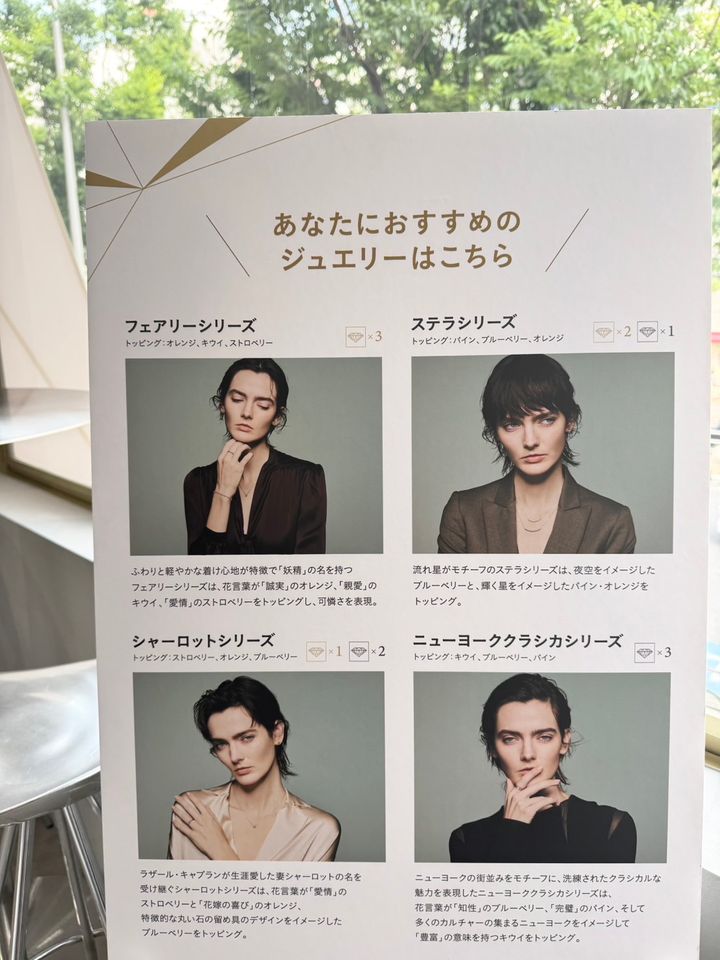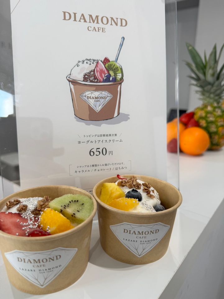 イベント会場では、診断結果に合わせたオリジナルスイーツを楽しめます。実はこのスイーツ、東京・中野にある老舗フルーツショップ「フタバフルーツ」とのコラボレーションなんです♡ 酸味がクセになるアイスヨーグルトに、旬のフレッシュフルーツをたっぷりトッピング。グラノーラのザクザク食感も楽しめる、ひんやりヘルシースイーツです。ジュエリーのキラキラとした輝きを彷彿させるアラザンも楽しげポイント。3種類から選べるシロップ(キャラメル/チョコレート/はちみつ)をかけて、いただきますー! ※支払いはキャッシュレス決済のみ