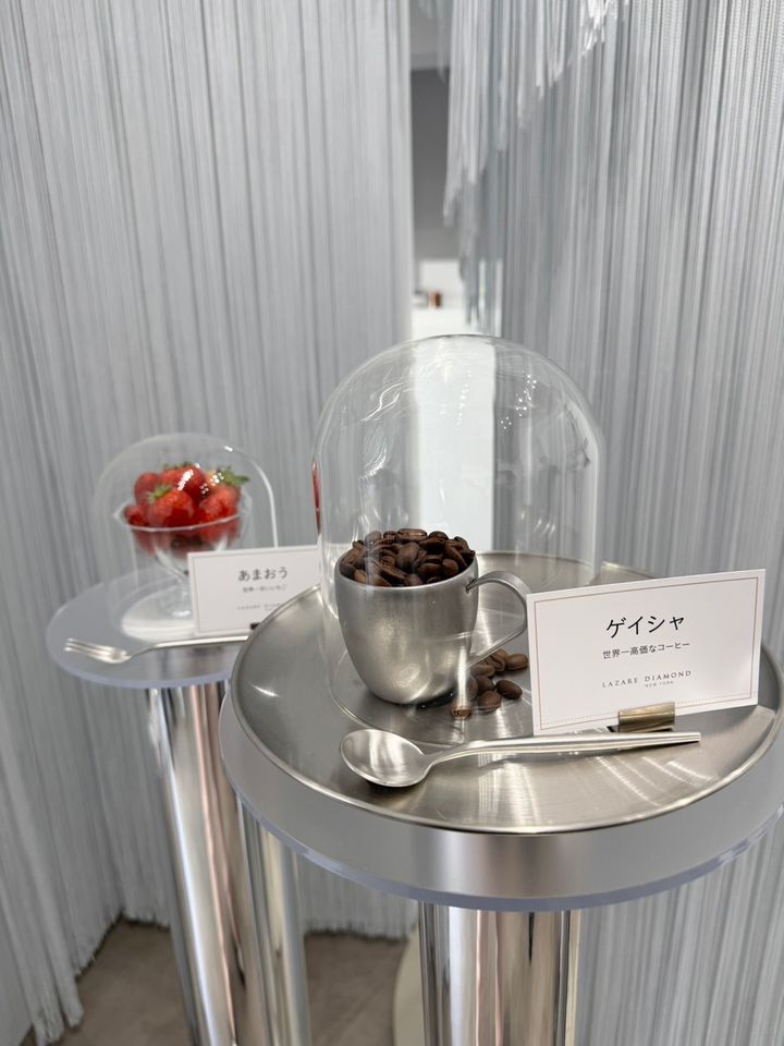 小道には、世界で一番美しいダイヤモンド【The World’s Most Beautiful DiamodⓇ】、「ラザール ダイヤモンド」にちなんで、世界一シリーズが並んでいました。世界一高価なコーヒー、世界一薄いパン、世界一甘いイチゴと、ユニークな仕掛けに思わず笑みが♡
