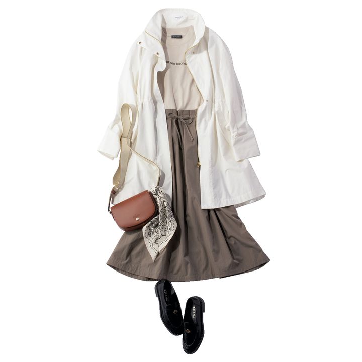 5.マウンパ¥14,850(オペーク ドット クリップ)バッグ¥79,200(ロンシャン/ロンシャン・ジャパン)ローファー¥19,800(ダイアナ/ダイアナ 銀座本店)スカーフ¥9,680(マニプリ)ワンピース着回し