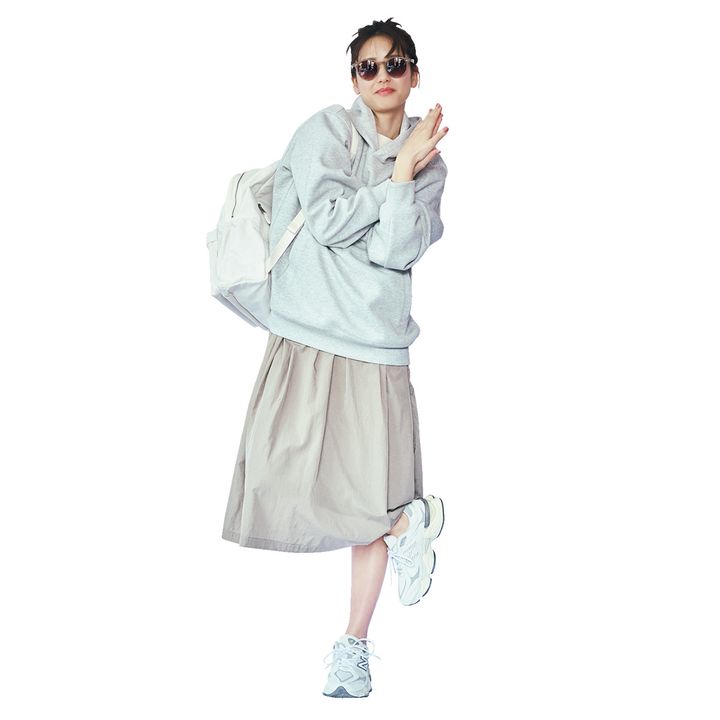 1.フーディ¥3,990(UNIQLO)バックパック¥24,200(ロペ エポール)スニーカー¥22,000(ニューバランス/ニューバランスジャパンお客様相談室)サングラス¥28,050(レイバン/ルックスオティカジャパン カスタマーサービス)ワンピース着回し