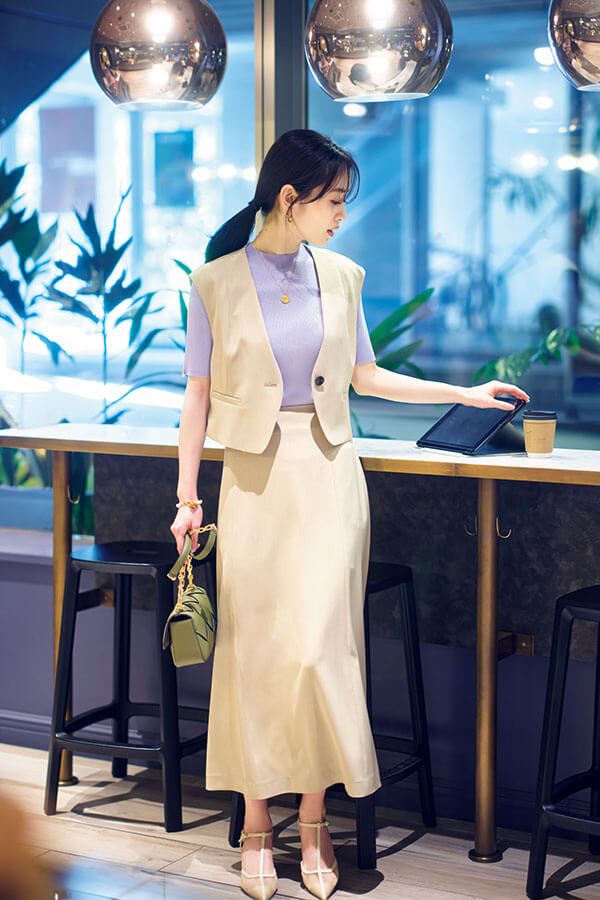 お仕事場面で頼りになるシンプルなベスト×スカートのセットは、休日服にもスライド可能。インナーのニットに旬カラーを投入して春らしさを演出♪