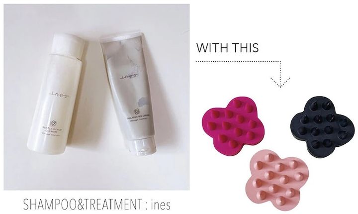 「シャンプー&トリートメントはケチらないことが大切です。使っているのが、シャンプーなのにスクラブ効果がある「イネス」のジェントルスクラブクレンズ(オープン価格・写真左)とクレイ成分配合トリートメントのタラソスパクリーム(3,300円・編集部調べ。写真右)。