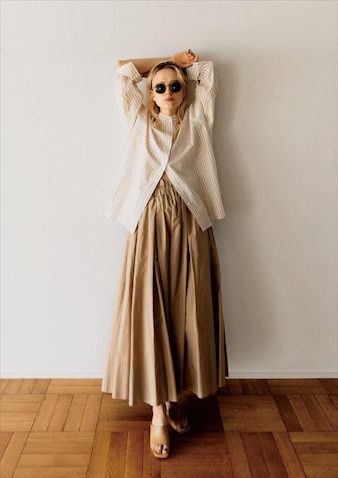 きちんと感のあるストライプシャツも、サイズ感をゆるめて羽織ることで、かしこまりすぎず自然体なムードに。「ボリュームのあるロングスカートと合わせれば、動きや空気感が生まれて、リラックスした印象に。足元はナチュラルなサンダルで抜け感をプラス。ベージュのワントーンでまとめることで、シンプルなのにどこか女性らしさと品の良さが漂う、頑張りすぎない余白のあるスタイルが今の気分です」