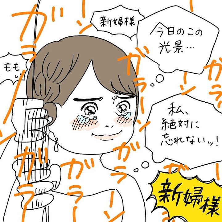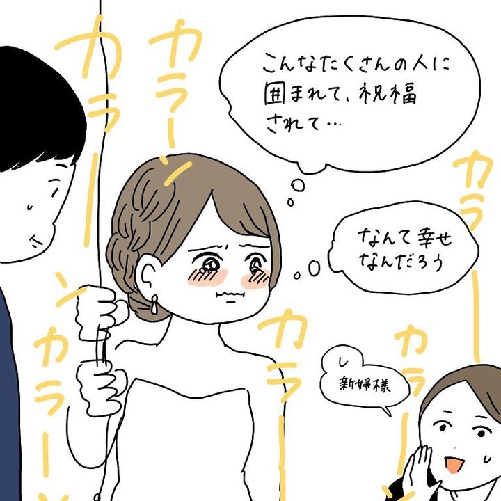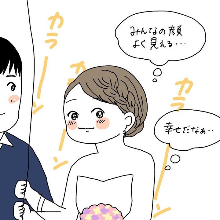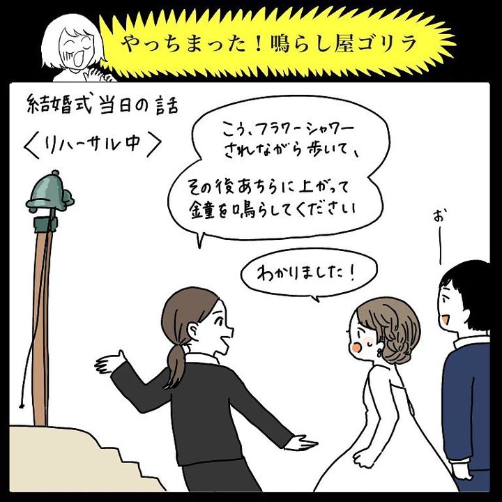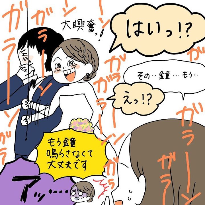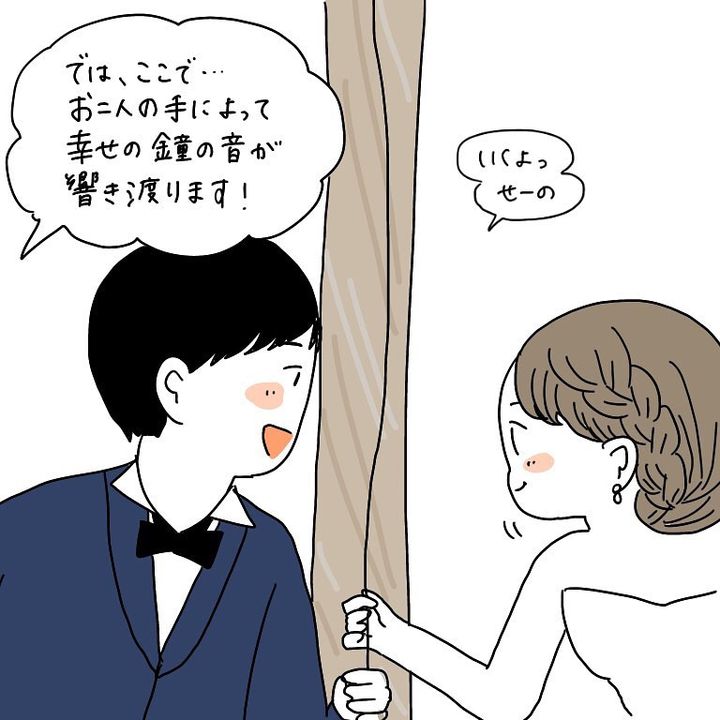 こんにちは!Instagramで日々の暮らしを漫画で紹介している、Web漫画家のmomoです。これはわたし自身の結婚式のお話。リハーサルも終えていよいよ本番。わたしは、感動して涙を流しながら鐘を鳴らしていたんですが、スタッフの方から「新婦さま!」と慌てて止める声が…。一体わたしは何をやらかしてしまったのか!?ある意味一生忘れられない結婚式の思い出、ぜひご覧ください!