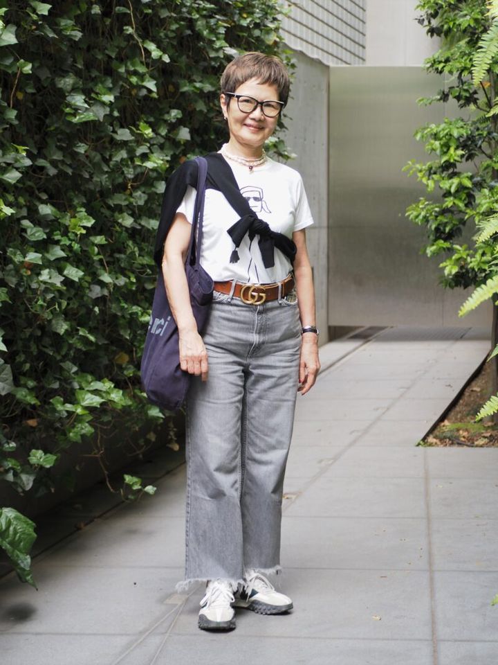 パリで購入したヴィンテージのホワイトTシャツに、グレーのデニム、スニーカーをオン。軽快な装いで表参道を歩く島崎さんを直撃! 肩にかけたブラックのカーディガンでコーディネートを引き締め、洗練された印象に仕上げています。ラグジュアリー感のある「グッチ」のベルトで、大人の品格をプラス。「50歳くらいの頃に髪をショートにしてから、着こなしの幅が広がったような。私は、みんなと同じは嫌なので(笑)、自由にファッションを楽しんでいる海外の方の着こなしに惹かれます」