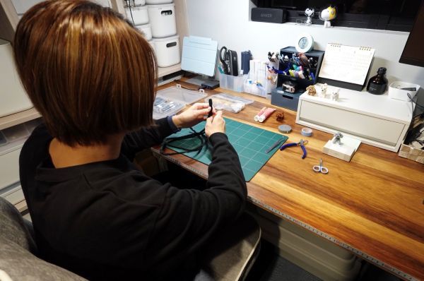 自宅工房で作業するれいかさん。ここで皆さんに届けする愛すべきミニアニマルが誕生していきます。 れいかさんは愛犬家で、向上心があり、観察眼もあって、何より思ったものを形に出来る指先の器用さを合わせ持った「令和の匠」「クラフトウーマン」だと確信しました。