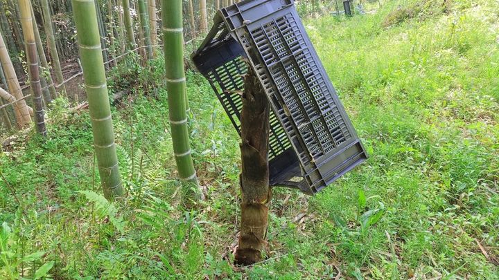 たった1日で一気に土から出てきて成長した竹。改めて成長スピードには驚かされますよね。前の日はまだ何もなかったのに、カゴがすっかり持ち上がっています。