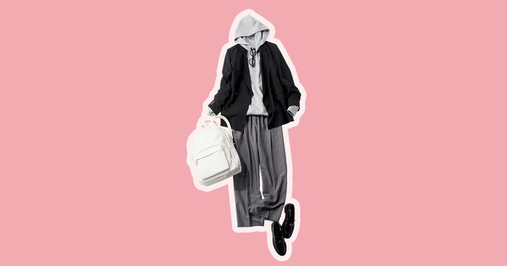 『CLASSY.』着回しDiaryから、おすすめコーデをピックアップ!ユニクロのフーディとグレーパンツのカジュアルワントーンコーデは、黒ジャケットで引き締めて。メガネやローファーなどの洒落見え小物を合わせると、フーディも部屋着感なく着こなせます!