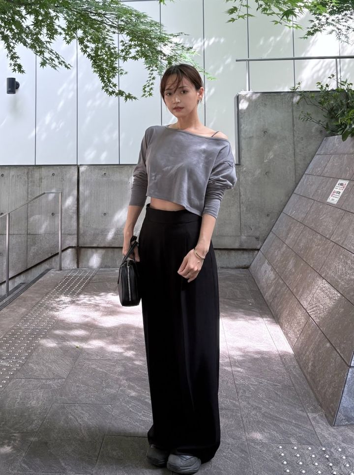 「華奢なゴールドのジュエリーが映えるよう、ボートネックにもオフショルにも出来る短丈トップスに、ハイウエストのワイドシルエットのボトムを合わせシンプルに。ほどよく肌見せをすることで女性らしさと洗練された雰囲気を取り入れたコーディネートにしています。足元はボリュームのある黒スニーカーでヌケ感をプラスしました」