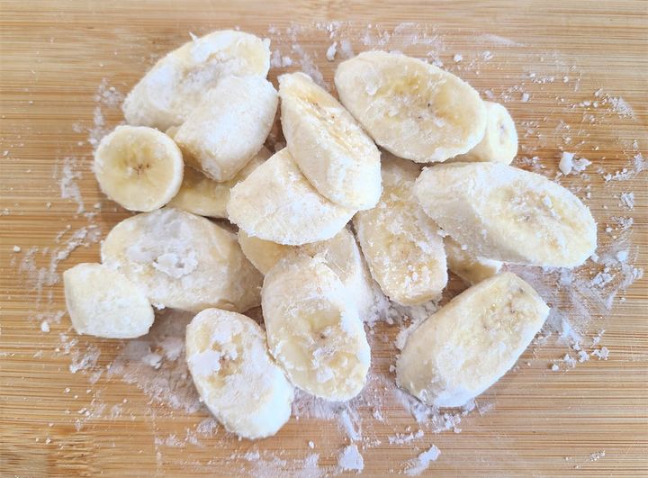 1. バナナを1cmくらいの厚さにスライスして、片栗粉をまんべんなくまぶしておきます。