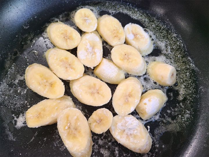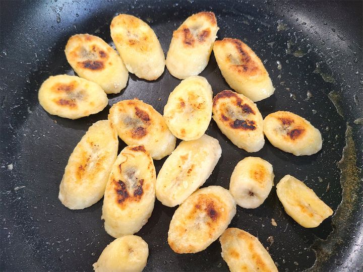 2. フライパンにバターとオリーブオイルを入れて中火で熱し、バナナを両面焼きます。