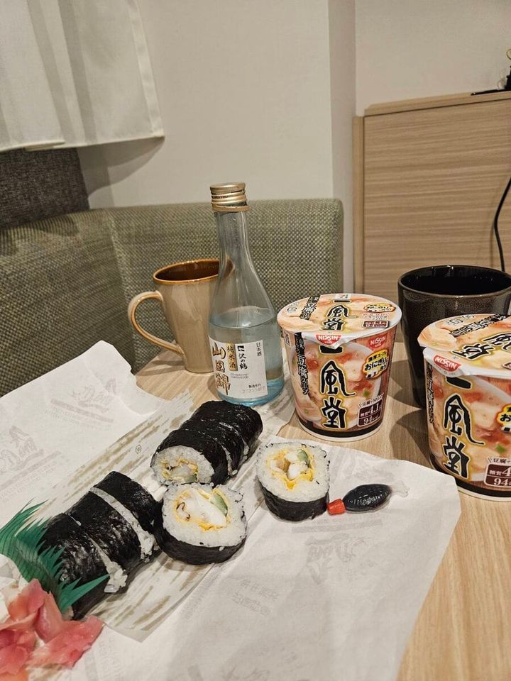 映えとは程遠いホテル呑みの様子がこちら。「〆に汁ものもほしいよねー」と、一風堂の豆腐スープ(これもおいしいですよねー)ともちろん日本酒も買ってホテルに戻り、深夜まで盛り上がって力尽きて寝落ち。気づけば朝でした。二人ともシャワーも浴びず……我ながら終わってます。が、楽しくていいお酒だったので二日酔いゼロ♡ 朝からマユリカさんの「うなげろりん!! #191」で爆笑しながら身支度をして、マンゲキ近くの「うどん そば 松屋」でかすうどんを食べて、元気に『mini 7月号』の撮影に向かったのでした!