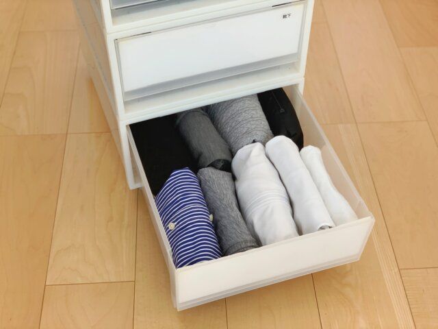 洋服はコンパクトにたたんで引き出しの中で重ねず並べて収納すると一枚ずつサッと取り出すことができるようになります。