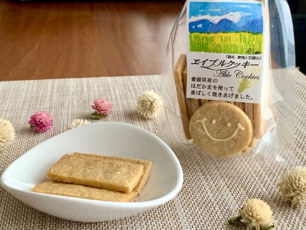 愛媛県産はだか麦を使用。スマイルクッキーも入っています。 これがとてもおいしい。サクサクほろり。口の中に拡がる香ばしい風味とちょうどいい甘さ。食べやすいサイズ。懐かしい味で止まらなくなってしまう…アレンジしても楽しそう。