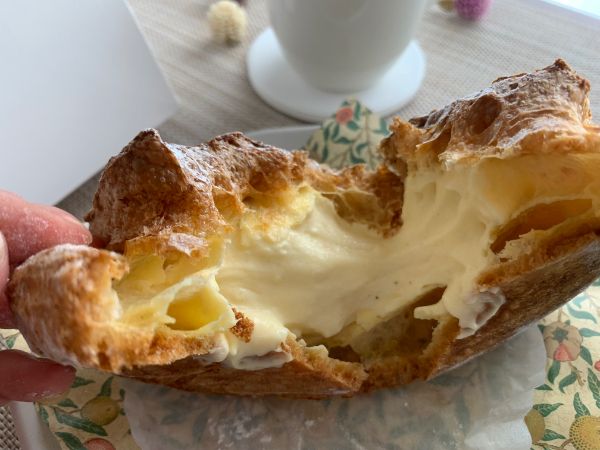 家で開けてみるとなぜかお店で見た時より大きく感じます。 が!サクサクと軽いシュー生地。たっぷりクリームはミルクを感じるあっさり味ですぐにペロリです。