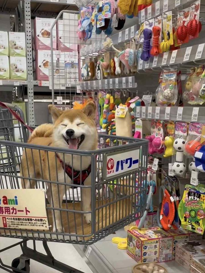 ショッピングカートに乗っているのは、柴犬『もも』ちゃん。 オモチャ売り場に並んだたくさんのオモチャを前に、満面の笑みを浮かべています。