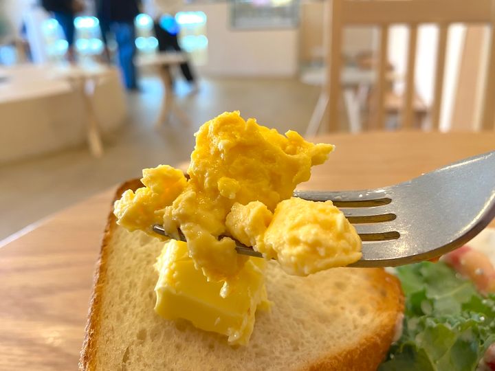 トーストされた食パンはほどよく歯ごたえがあり、素朴な味わいが塩味のあるウインナーと相性抜群です。やさしい甘さのスクランブルエッグは、秘密のレシピでふわふわに仕上げられていて他のトッピングの食感を引き立たせています。野菜もたっぷり添えられているのはうれしいですね!