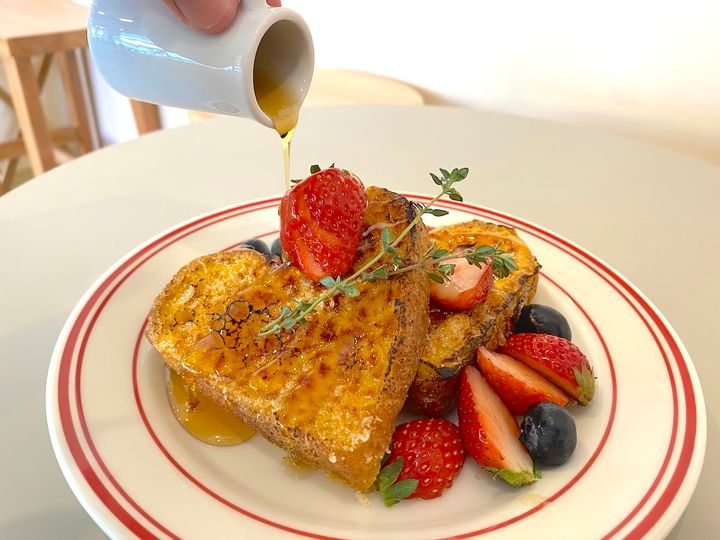 訪れたらぜひ食べてもらいたいのがSNS映えするかわいいビジュアルの「シーズンフレンチトースト」です。ハート型のオリジナル食パンを使ったフレンチトーストに季節ごとに変わるフルーツとタイムをぜいたくにトッピング。取材時(2025年4月)はイチゴとブルーベリーがのっていて、ベリー感を存分に楽しめる仕上がりでした。