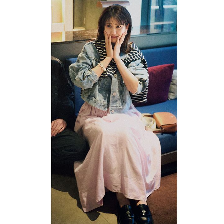 4.キャミソール¥7,700(ノーク)ボーダーカットソー¥11,000(ヘリーハンセン/ヘリーハンセン 原宿店)スカート¥49,500(エンリカ)バッグ¥79,200(ロンシャン/ロンシャン・ジャパン)ローファー¥19,800(ダイアナ/ダイアナ 銀座本店)イヤリング¥11,000ブレスレット¥16,200(ともにアビステ)Gジャン着回し
