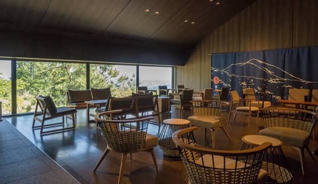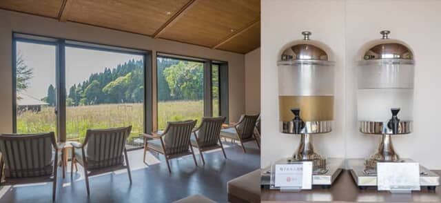 フロントから客室へ向かう途中にあるラウンジ兼トラベルライブラリー。鹿児島や霧島の風土や文化、お茶や焼酎などの書籍をそろえ、窓際のソファに座ると、野生の鹿を目にすることもあるそうです。