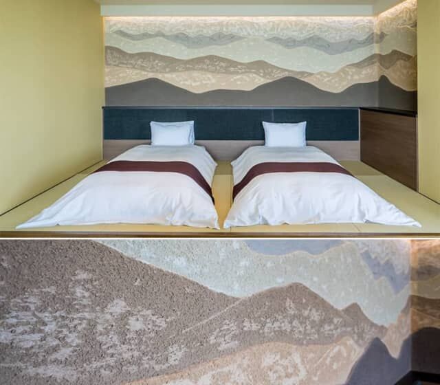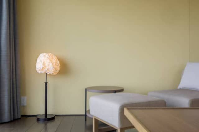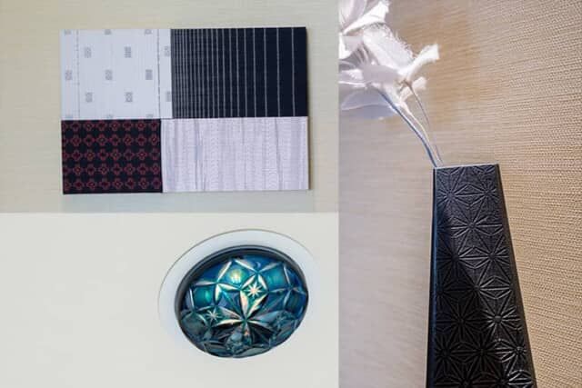 館内や客室内には薩摩藩の重要な財源として奨励された伝統工芸品が飾られます。大島紬のアートや、天井の照明に取り付けられた薩摩切子、薩摩錫の花瓶などが部屋に彩を添えました。