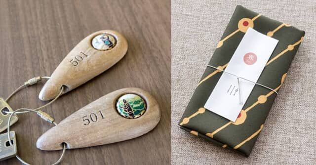 ルームキーには、鹿児島特有の白土(シラス)を焼いた薩摩焼「白薩摩」に、繊細な模様を描き込む薩摩ボタンがはめ込まれ、『天孫降臨』のワンシーンが描かれています。界ブランドの宿に必ず用意されるアメニティを包んだ風呂敷は、霧島の自然やお茶に通じる深い色でした。