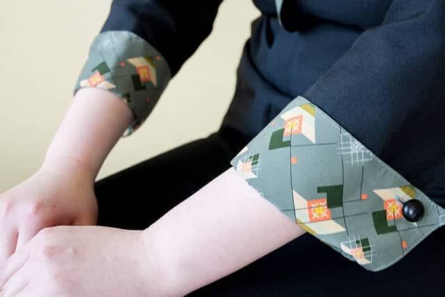 ▲スタッフのユニフォームにある霧島をイメージした柄