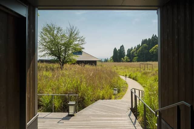 神話の時代がそのまま残っているようなすすき野原を、ボードウォークが湯浴み小屋へと続きます。春になると途中の桜が目を楽しませてくれるのだとか。