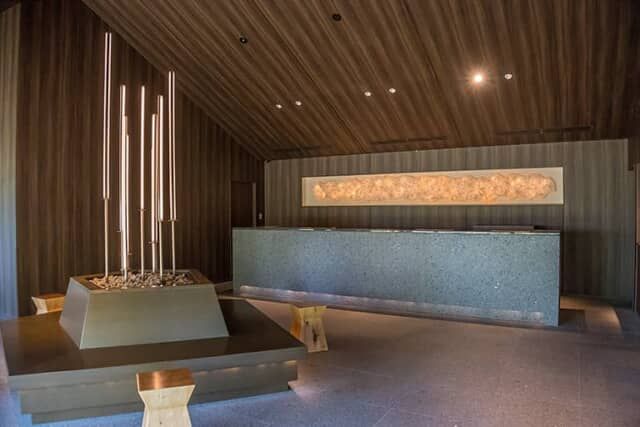 装飾を抑えたフロントカウンターの背後には、薩摩和紙を使った日本の伝統模様 “麻柄” の立体アートが飾られます。さらに宿がある高千穂峰は『天孫降臨』神話の舞台で、山頂に降り立った瓊瓊杵尊(ニニギノミコト)が突き立てた逆鉾から着想を得たオブジェを、フロント前のベンチに再現。神話の世界への入口が現れたようなしつらえです。