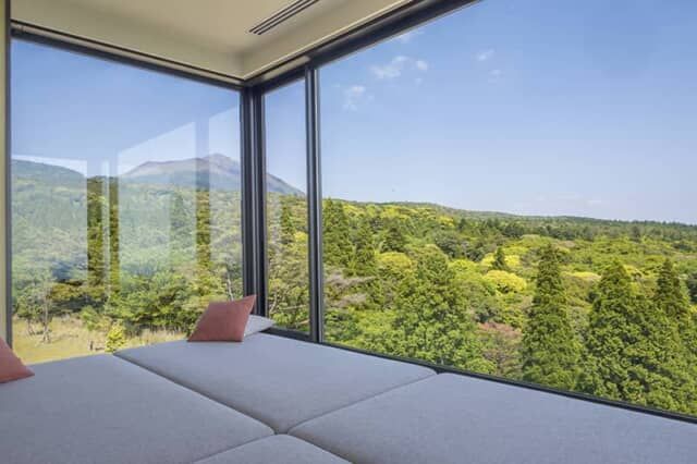 特別室には建物から張り出したガラス張りのパノラマルームを備えていて、柔らかなマットの上でくつろぎながら270度の絶景を満喫。写真左手の小高い峰が、ニニギノミコトが降臨し9本の逆さ鉾を突き立てた高千穂峰(1,574m)。神話の舞台を間近に見られる驚きの客室です。