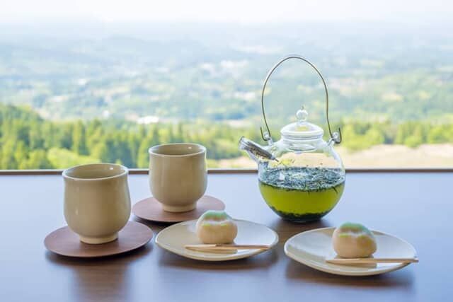 宿がある霧島高原はお茶の名産地。鹿児島空港の周囲にも一面の茶畑が広がります。トラベルライブラリーには「プレミアム霧島煎茶」や「あさのか有機煎茶」などの霧島茶が用意され、滞在中はいつでも自由に飲むことができます。