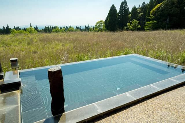 大浴場は客室棟から50メートルほど下だったすすき野原にある湯浴み小屋です。露天風呂からは原野が広がり、神話の時代から続く原初の風景を見ているような体験です。