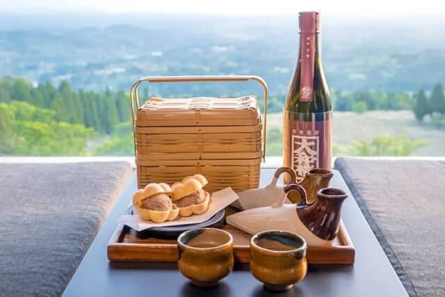 ビューテラスや客室など好きな場所で楽しめる「だれやめセット」。“だれやめ” とは南九州の方言で晩酌のこと。大和桜酒造の焼酎「大和桜 紅芋」と、日置市にある梅月堂のラム酒が利いたアイス最中「ラムドラアイス」をセットで楽しめます。ハト燗に入った焼酎とのペアリングは美味しい組み合わせです。