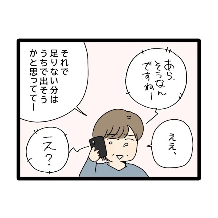 すると、それを聞いた義母が、「あら、そうなんですねー」と答えると、「それで、足りない分はうちで出そうかと思っててー」お母さんの言葉に「え??」義母が驚いてそう呟くと、