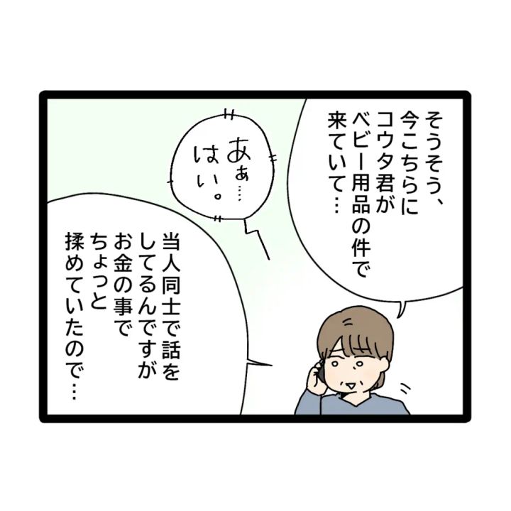 「そうそう、今こちらにコウタくんがベビー用品の件で来ていて・・当人同士で話をしてるんですが、お金のことでちょっと揉めていたので・・」とお母さんが言いました。