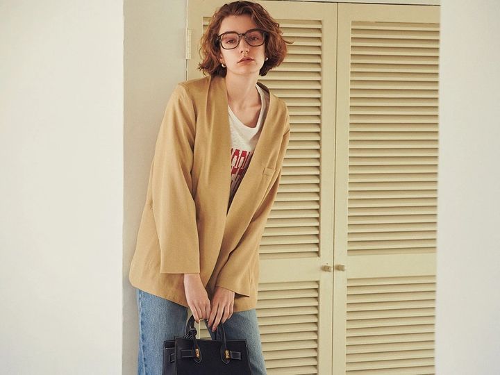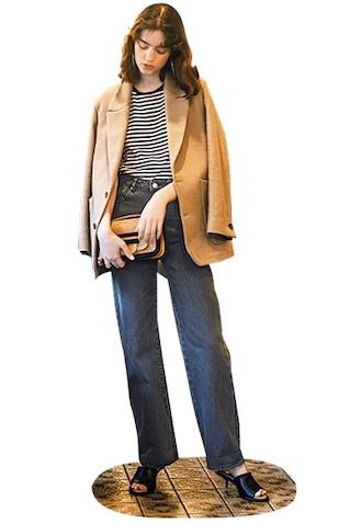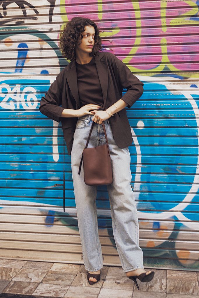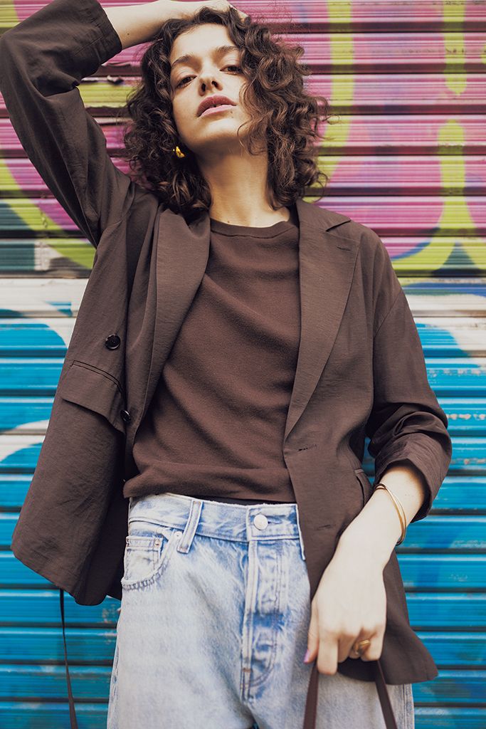 ベージュより引き締まって見えつつ、かといって黒ほど堅苦しくはない、乾いた質感のブラウンジャケット。あせたブルーデニムの気楽さをキープしたまま、渋い色みの効果で、感度の高いスタイリングが完成。デコルテや足元に素肌をのぞかせて、季節に見合ったバランスに。