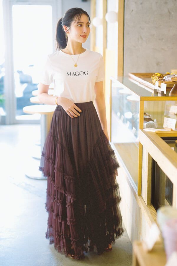 スカート¥49,500/ソブ(フィルム) Tシャツ¥7,700/FRAY I.D イヤリング¥3,300/アネモネ(サンポークリエイト) ネックレス¥11,000/チビ・ジュエルズ(チビジュエルズ・ジャパン) バングル¥32,560/ソコ(ズットホリック) バッグ¥38,500/セツコ サジテール(サジテール) サンダル¥20,900/タラントン by ダイアナ(ダイアナ 銀座本店)