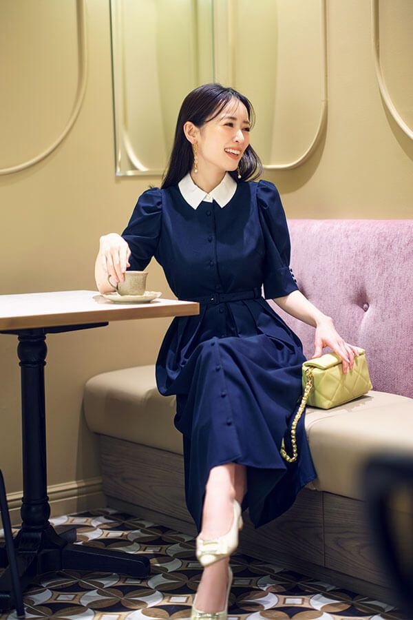 週末は【Swingle】の襟付きワンピースでおめかし♪気品あふれるネイビーカラーが大人っぽい!