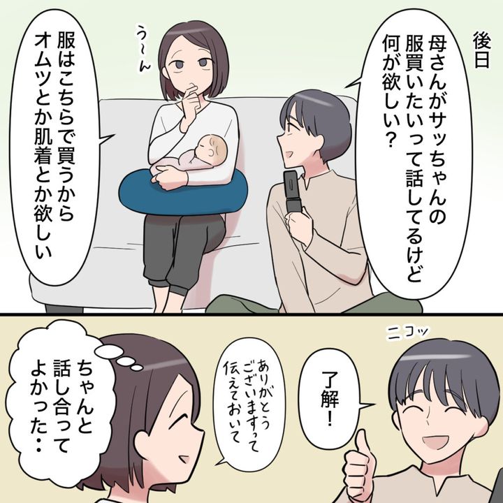 義母は肌着やオムツが欲しいというナエさんの意見よりも、服を贈りたいと言う気持ちが大きかったようです。ナエさんの意見や気持ちはショウタさんにも義母にも届かないようですね。