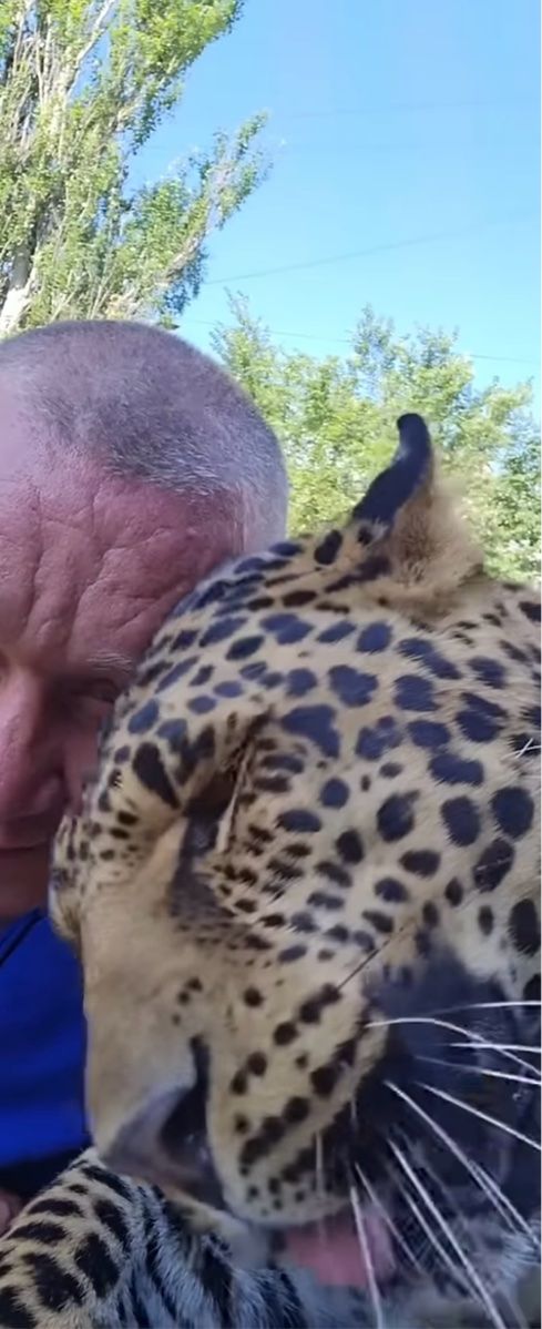 その美しい斑点模様と鋭い眼差しは、大きなネコのよう。 飼い主さんの顔に自分の顔をすり寄せているこの子は・・・、ヒョウではないですか!