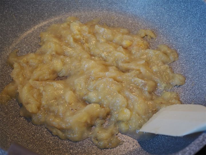 動画では、全体がとろっとしたキャラメル色の液状に近くなり、バナナがカケラになるくらいまで煮ていました。
