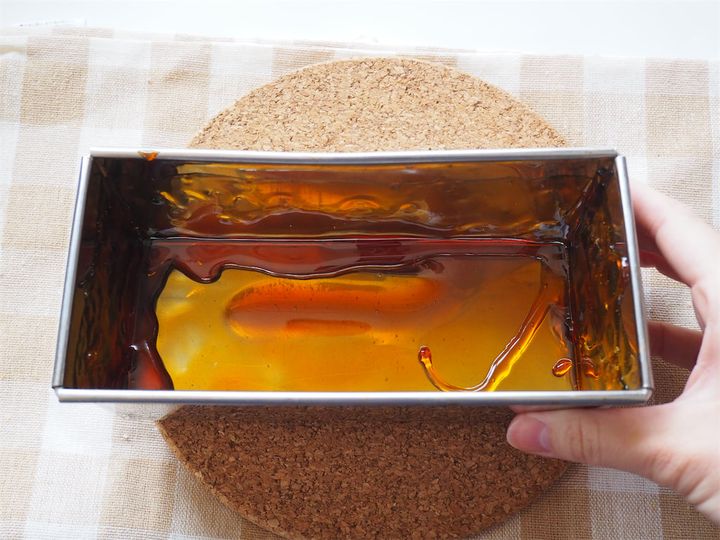 冷えるとカラメルが固まってしまうので、側面まで素早く広げていきましょう!