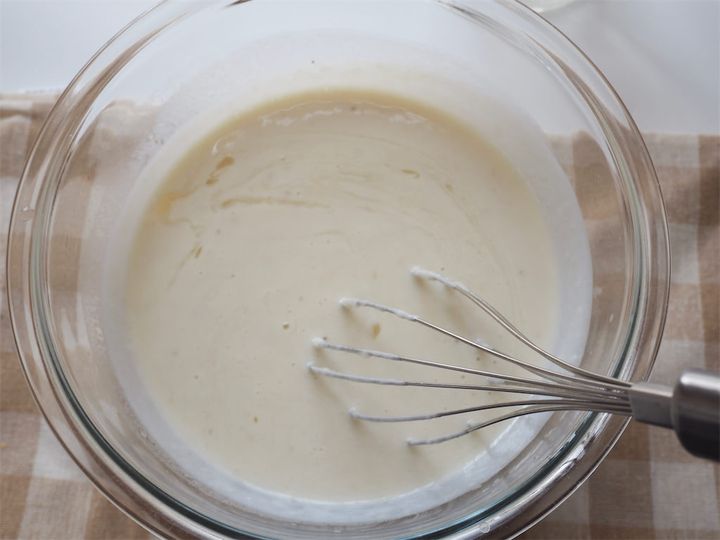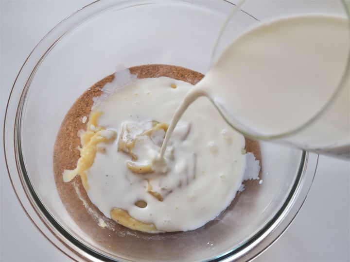6. 5に牛乳を加えて、しっかりと混ぜ合わせる。