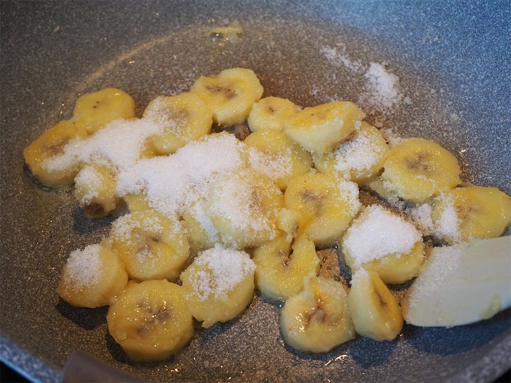 4. バナナがとろっとしてきたら砂糖を加え、混ぜ合わせながらさらに炒める。