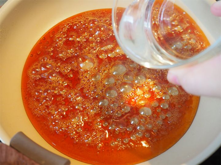 水を入れるとカラメルが飛ぶこともあるので、十分に気をつけてください。フライパンのフタでバリアをしても◎。