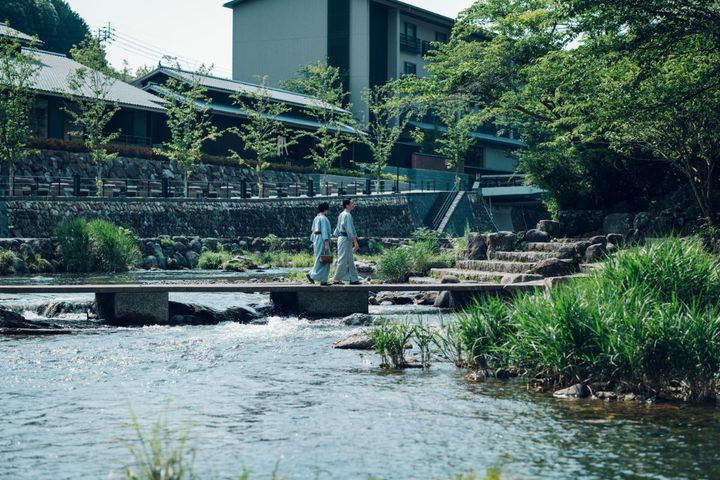 温泉街を一望できる竹林の階段を設置したり、川床やテラス、足湯などを設けて、浴衣を着てそぞろ歩きが楽しめる温泉街になっています。飲食店やおみやげ店も点在し、食べ歩きも楽しめちゃうんですよ!