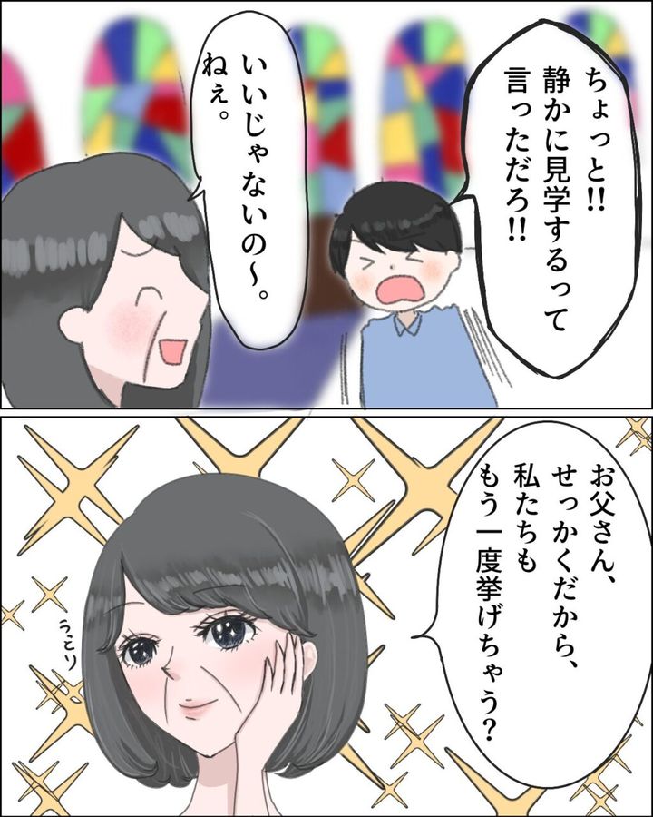 「ちょっと!!静かに見学するって言っただろ!!」と注意する良太に「いいじゃないの~。ねぇ」と全く反省していない義母。そして、「お父さん、せっかくだから私たちももう一度挙げちゃう?」うっとりしながら義母が言いました。