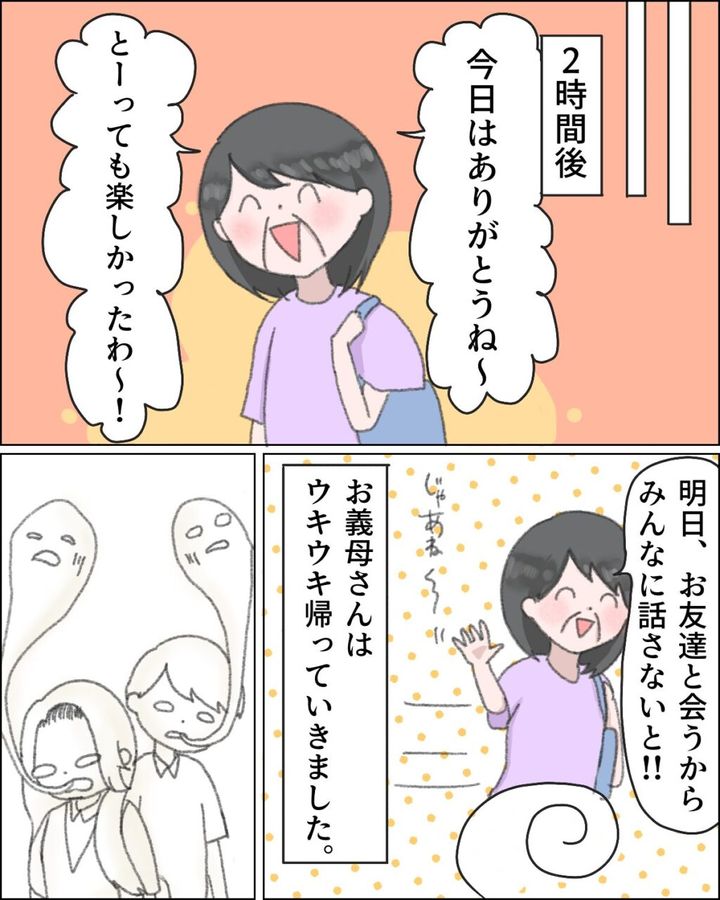 「今日はありがとうね!とーっても楽しかったわ~!」と言うと、「明日、お友達と会うからみんなに話さないと!じゃあね~」そう言ってウキウキで帰って行った義母。すっかり呆れた良太と私で義母を見送った後、