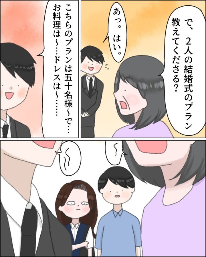 その後、「で、2人の結婚式のプラン教えてくださる?」義母が担当者にたずねると、「あっ。はい。こちらのプランは50名様~で・・お料理は~・・ドレスは~・・」担当者が答えると、その後は義母とずっとやりとり。そんな2人の姿を良太と私は呆然と眺めていました。
